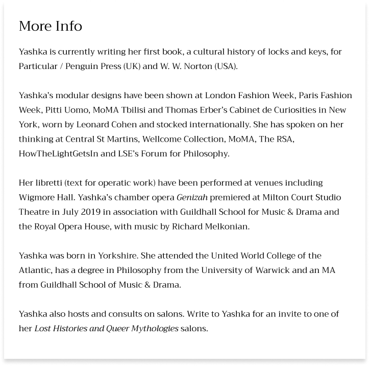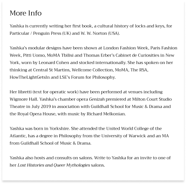Her libretti (text for operatic work) have been performed at venues including Wigmore Hall. Yashka’s chamber opera Genizah premiered at Milton Court Studio Theatre in July 2019 in association with the Guildhall School for Music & Drama and the Royal Opera House, with music by Richard Melkonian. Yashka also holds Lost Histories and Queer Mythologies salons. Email her for an invite.